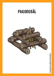 Kortene som hører til dette møtet: Illustrasjon av dobbeltneve, tynn opptenningskvist og større vedkubbe. Illustrasjon av pagodebål, oppskrift og fremgangsmåte for pinnebrød og sjokoladebanan.